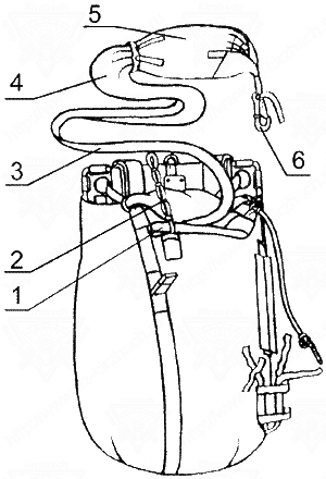 Рис. 55. Монтаж стабилизирующего парашюта на верхнюю часть ранца с уложенным основным парашютом: 1 - сота резиновая на ранце; 2 - карабин; 3 - кольцо, 4 - лента зачековки Date: 2015-08-06; view: 463; Нарушение авторских прав |