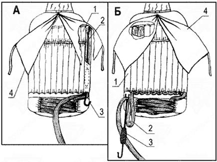 Стяните верхнюю часть камеры шнуром-завязкой и завяжите любым легко развязывающимся узлом так, чтобы узел соединения уздечек купола и камеры с петлей звена находился сверху (рис.24, А).