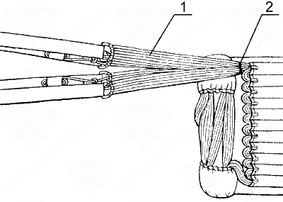 1 - сота; 2 - пучок строп; 3 - вилка с крючком; 4 - фартуки Отмерьте пучок строп по длине следующей соты и с помощью вилки с крючком уложите его в следующую соту. Таким образом произведите укладку строп во все соты справа налево (рис.25, Б), оставив неуложенным участок строп от меток до свободных концов (рис.26). При этом допускается последний пучок строп укладывать в соту, не пропуская его под резину сот.