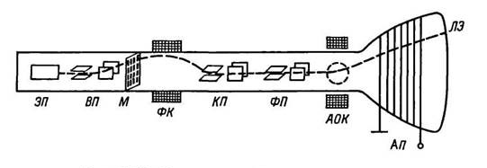 Принцип устройства одного из характронов показан на рис. 20.29. Электронный луч, изображенный штриховой линией, создается электронным прожектором ЭП. Две пары отклоняющих пластин, называемых выбирающими (ВП), направляют луч на матрицу М. Она представляет собой металлическую пластину с отверстиями в форме тех или иных знаков. Число отверстий может быть несколько десятков, а их размер не превышает десятых долей миллиметра и несколько меньше диаметра луча. На выбирающие пластины подаются необходимые напряжения от управляющего устройства, которым «командует» ЭВМ. После матрицы электронный луч в сечении приобретает форму соответствующего знака. Так как, пройдя матрицу, луч отклоняется к стенке трубки, то с помощью фокусирующей катушки ФК и корректирующих пластин КП луч снова направляется вдоль оси трубки и проходит формулярные пластины ФП, служащие для небольшого отклонения луча в пределах формуляра. Конечно, напряжения на КП и ФП согласованы с напряжениями на ВП. Фокусирующая катушка имеет еще дополнительные обмотки для компенсации наклона знаков, возникающего под действием магнитного поля основной обмотки. Для того чтобы формуляр был виден на экране именно в том месте, которое соответствует координатам данного объекта, служат адресные отклоняющие катушки АОК. Электронный прожектор работает при сравнительно невысоких напряжениях, и поэтому скорость электронов в луче не очень велика. Это позволяет отклонять луч с помощью не слишком больших напряжений и токов, что упрощает управляющее устройство. Для повышения яркости формуляров применяется послеускорение. Анод послеускорения АН сделан в виде проводящего винтового ленточного слоя с большим сопротивлением. Напряжение послеускорения постепенно возрастает от витка к витку такого анода, и это обеспечивает минимальные искажения изображения на экране. Конечно, существуют характроны и других типов, у которых вместо отклоняющих пластин применяются отклоняющие катушки и, наоборот, вместо отклоняющих катушек — отклоняющие пластины, а также имеются некоторые дополнительные детали.