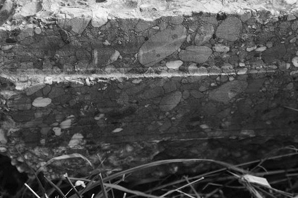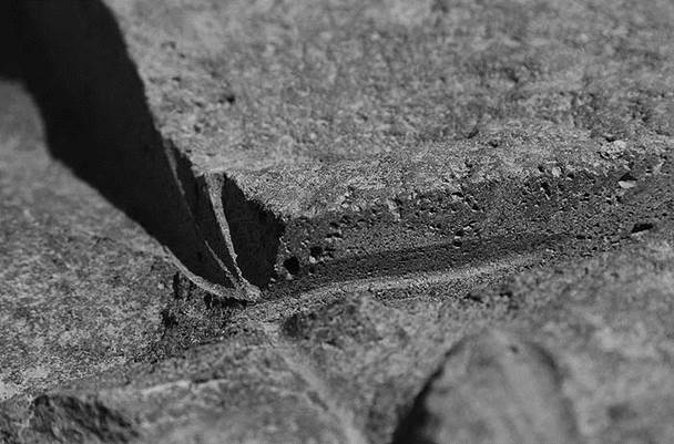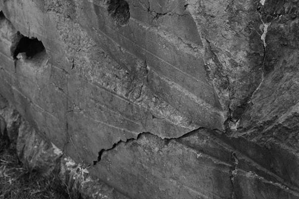 Рис. 5-ц. Случайные надпилы на блоке чёрного базальта