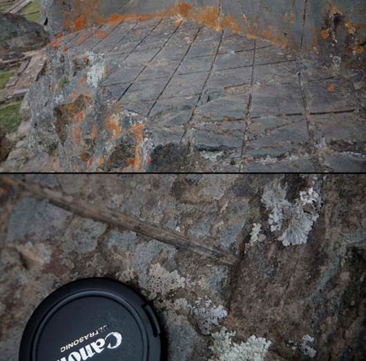 Поражает глубина надреза. Его форма (см. Рис. 10-ц) указывает на то, что все было сделано буквально за один проход инструмента, который при этом заглублялся сразу на 10-15 сантиметров. Между тем при работе современной болгаркой со стальным диском и алмазным напылением мастер, даже налегая на болгарку всем своим весом, может углубиться в твердый черный базальт за один проход всего на миллиметр-полтора, то есть в сто раз меньше!..