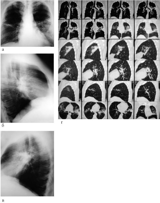 Пациент Д., 58 лет (рис. 3.3). Рентгенограммы органов грудной полости в прямой (рис. 3.3 а), правой (рис. 3.3 б) и левой боковой (рис. 3.3 в) проекциях. С обеих сторон, больше слева, преимущественно в SIV-Vобнаруживаются затемнения средней интенсивности, неоднородной структуры, на его фоне видны светлые полоски бронхов, объём поражённых сегментов не изменён. Оба корня расширены, не структурны, в них видны увеличенные лимфатические узлы. В других отделах справа и слева лёгочные поля прозрачны, лёгочный рисунок не изменён. Тень средостения не смещена, несколько расширена за счёт левого желудочка сердца, аорта имеет обычное расположение и диаметр, уплотнена. Синусы плевры свободны. Диафрагма расположена на уровне VI ребра, форма её куполообразная. Заключение: двухсторонняя паренхиматозная пневмония преимущественно в язычковых сегментах, возрастные изменения сердца и аорты. Рентгенограммы органов грудной полости в прямой, правой и левой боковой проекциях через 10 дней.