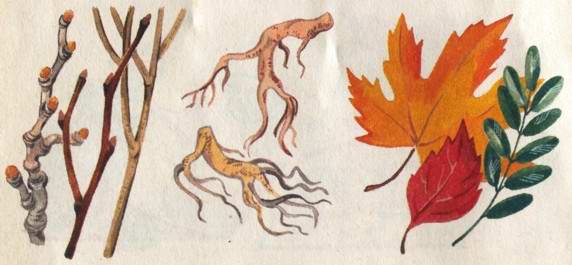Рис. 5 Ветки (рис. 5). Разнообразные ветки используются при изготовлении некоторых частей поделки: рук, ног, шеи и т. д. С этой целью лучше использовать ветки кизила, сосны, ели, сирени. Их ветки упруги и при высыхании не так легко ломаются. Сбор веток — работа, требующая времени, терпения, аккуратности. При этом необходимо постоянно напоминать детям, что деревья нужно беречь и для игрушек собирать и использовать только сухие, но не слишком пересохшие ветки. Корни (рис. 5). Для поделок могут быть использованы также и корни. Они иногда своими причудливыми формами напоминают различных животных или части их тела. Здесь особенно важно образное видение и наблюдательность, которые необходимо развивать у детей. Детская фантазия в изогнутых корнях поможет увидеть осьминога, паука и т. д. Множество старых корней или их отростков можно найти у берегов рек. При сборе этого материала надо также напомнить детям, что корни живых деревьев неприкосновенны. Собранные корни нужно вымыть и хранить в помещении с умеренной влажностью. Листья (рис. 5). Интересным и нужным дополнением при изготовлении игрушек являются листья. Они могут быть самых разнообразных форм и расцветок. Крупный лист дуба, клена дети применяют как парус для яхты, плота, парохода. Листья можно также использовать для изготовления крыльев бабочки, плавников рыбки (эти игрушки делаются из шишек и листьев). Собирать листья лучше осенью, когда они особенно красивы. Для сохранения и последующего использования листьев их необходимо правильно заготовлять. Для этого собранные листья растений кладут между бумажными листами и проглаживают теплым утюгом, затем их можно переложить плотной бумагой или тонким картоном и положить сверху груз. При длительном хранении бумагу или картон, находящийся между листьями, время от времени следует менять. Семена. Ценным дополнением к игрушкам из природного материала могут быть семена деревьев, цветов, овощей, например семена клена, ясеня. Они известны детям как крылатки. Из них можно сделать крылья для стрекозы, уши для зайца, плавники для рыбки, а из семян липы хорошо получаются антенны для космонавтов, лапы животных; из семян арбуза, дыни, подсолнуха, крупных семян таких цветов, как зорянка, лазоревые цветы, можно смастерить глаза. Собирать семена лучше осенью.