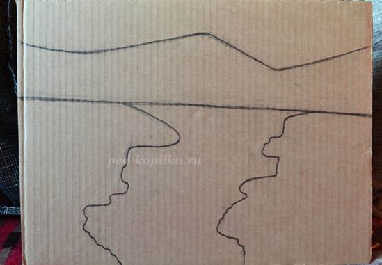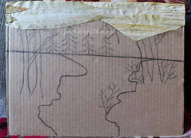 Внимание! Все растения взаимозаменяемы, поэтому, если перечисленные растения не окажутся у вас под рукой, их можно заменить похожими по цвету и фактуре. Перед началом работы лёгкими штрихами выполняем набросок на плотном картоне с минимальной проработкой, учитывая возможность импровизировать в процессе работы. Намечаем контуры изображения, уделяя особое внимание основным линиям и формам – горизонту, переднему плану.