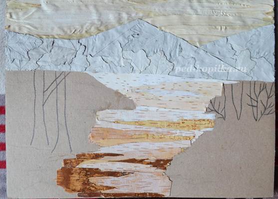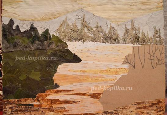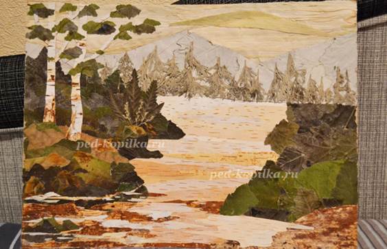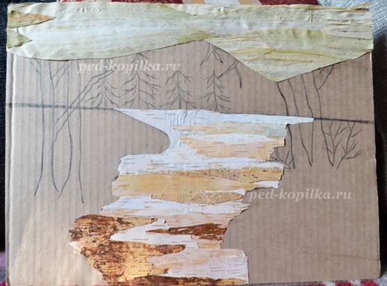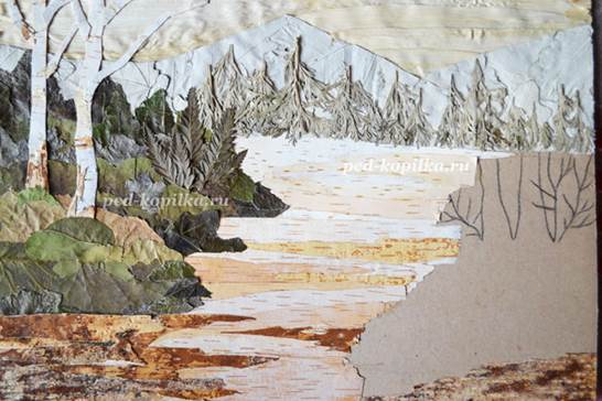 Возвращаемся к левому берегу для детального изображения природы. Намечаем место расположения берёз. Мы должны учитывать, что разные деревья имеют различное анатомическое строение, для которого характерны определённые формы ветвей, ствола, кроны. Для коры берёз подойдёт внешний слой бересты. Вырезаем ножницами нужную форму ствола и ветвей и приклеиваем согласно плану. Более тёмные кусочки бересты ставим на теневую сторону стволов. Усиливаем тени на берёзах и кое-где приклеиваем на стволы наросты. На дальнем плане берега размещаем кустарник из листьев розы.