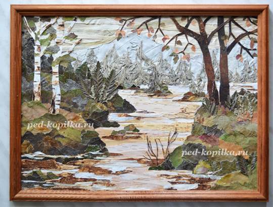 Переходим к более тщательной проработке деталей правого берега. Листва на деревьях выкладывается листьями земляники, клёна, тополя и калины приёмом обрывания. У основания деревьев располагаем кустарник с помощью листьев розы. Для крутого ступенчатого берега используем листья тополя, жёлтого и красного клёна, лопуха и лепестков жёлтой розы, наклеивая кусочки рядами, чередуя светлый и тёмный цвета. В самом низу берега изображаем кустарник из тонких веточек берёзы или усиков виноградной лозы. Возвращаемся к поверхности воды. При работе над водой нужно помнить, что все тёмные краски, отражаясь, выглядят более светлыми, а светлые – более тёмными. Для отражения левого берега в воде использованы листья тополя. Отражения, как правило, имеют волнистые, нечёткие контуры, поэтому чтобы создать рваные края у растений их нужно поскоблить ножницами. Поверхность воды подёрнута лёгкой рябью. Чтобы подчеркнуть это, применен материал неровный и изломанный. Для данного эффекта использована рваная береста внутренней части тёмной коры, а внешняя часть, более светлая использована для изображения бликов. Правый берег менее затемнён растительностью, поэтому для отражения и ряби подошла береста более светлых оттенков. На дальнем плане изображаем небольшие островки из листьев серого тополя и лепестков жёлтой розы. Не забываем про туманную даль. Поэтому на островках располагаем растения из полыни разных светлых оттенков.