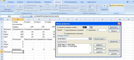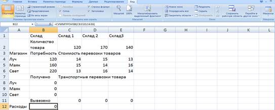 1. Постановка задачи. 1.1 В задаче требуется достичь min расходов за перевозку товаров. Расходы на перевозку товаров – это целевая функция, значение которой нужно определить. 1.2 Расходы на перевозку товаров зависят от планируемого для перевозки количества товара из каждого склада в каждый магазин. 1.3 Ограничения: - магазины должны получить столько товара, сколько им требуется; - со складов вывозится весь товар; - количество товара должно выражаться целым числом; - количество товара должно быть неотрицательным числом.