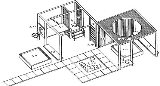 Рис. 5. Планировка игровой площадки дошкольной группы (4-5 лет) (ЦНИИЭП учебных зданий) Тематическая площадка может заменять собой групповую площадку детей дошкольного возраста. Тематические площадки, в отличие от групповых, строго не закрепляются за отдельными группами. Их размещение на участке дает возможность перехода с одной площадки на другую, что разнообразит игровую деятельность детей и способствует большему развитию их воображения и фантазии. Тематические площадки имеют определенную сюжетную направленность, которой должен быть подчинен характер планировки и оборудования (рис. 6). Тематические площадки подразделяются на две основные группы: для приключенческих игр ("индейская деревня", "космическая"); для творческих игр ("транспортная", "строительная"), для художественных занятий. Для обеспечения необходимых условий инсоляции и солнцезащиты на групповых площадках рекомендуется создавать две контрастные по режиму радиационные зоны - открытую и затененную. Для изоляции групповых площадок применяется зеленая изгородь из кустарников в одну полосу шириной 0,75-1 м. Расстояние между посадками в зеленой изгороди зависит от породы растений и величины их кроны. Рекомендуемая высота зеленой изгороди групповой площадки 0,8 м. В особых условиях ограниченности территории групповые площадки могут располагаться на эксплуатируемой кровле здания (рис. 7). В этом случае их площадь может корректироваться в сторону уменьшения до 50%. Площадки, размещаемые на кровле, должны иметь ограждение высотой не менее 1,6 м без горизонтальных членений. Просветность вертикальных элементов должна быть не более 0,1 м.