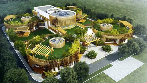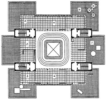 Рис. 7. Пример размещения групповых площадок на эксплуатируемой кровле здания. Комплекс яслей-сада на 480 мест в г. Ульяновске (ЦНИИЭП учебных зданий) 1 - "класс"; 2 - "море"; 3 - "крепость"; 4 - для тихих игр; 5 - для строительных материалов
