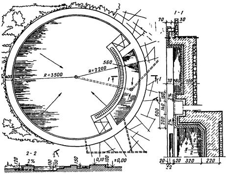 Рис. 10. Планировка и конструктивное решение плескательного бассейна (опыт НРБ) а - план; б - разрез 1-1; в - разрез 2-2; 1 - облицовочная плитка; 2 - цементная стяжка; 3 - гидроизоляция; 4 - бетон; 5 - дренаж Фонтанчики. Для закаливания детей и игр с водой на участке могут устраиваться фигурные фонтанчики и водные забавы (рис.11). Эти устройства значительно превосходят плескательные бассейны по игровым, гигиеническим и оздоровительным качествам. Фигурные фонтанчики типа "круглый дождь", "спираль", выполняются из алюминиевых или стальных труб, в которые под давлением подается вода и разбрызгивается в виде тонких струй и водяной пыли. Фигурные фонтанчики имеют небольшую чашу-бассейн, которая вмещает одновременно трех-четырех детей. Водная забава на 10-20 детей представляет собой- забетонированную или выложенную плитками площадку (10-18м2), по периметру которой расположены разбрызгивающие устройства с вертикально, горизонтально или наклонно бьющими струями. а)