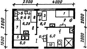 Рис. 16. Примеры планировки медицинских помещений в яслях-садах вместимостью а - до 150 мест; б - до 280 мест; в - 280 и более мест; I - приемная; II - палата; III - медицинский кабинет; IV - процедурный кабинет; V - туалетная; 1 - кушетка медицинская; 2 - шкаф для медикаментов; 3 - стол воспитателя; 4 - стул для взрослых; 5 - стол сервировочный; 6 - стул детский;7 - кровать детская стационарная; 8 - кровать детская с ограждением; 9 - тумбочка медицинская; 10 - шкаф для хранения дезинфицирующих средств.