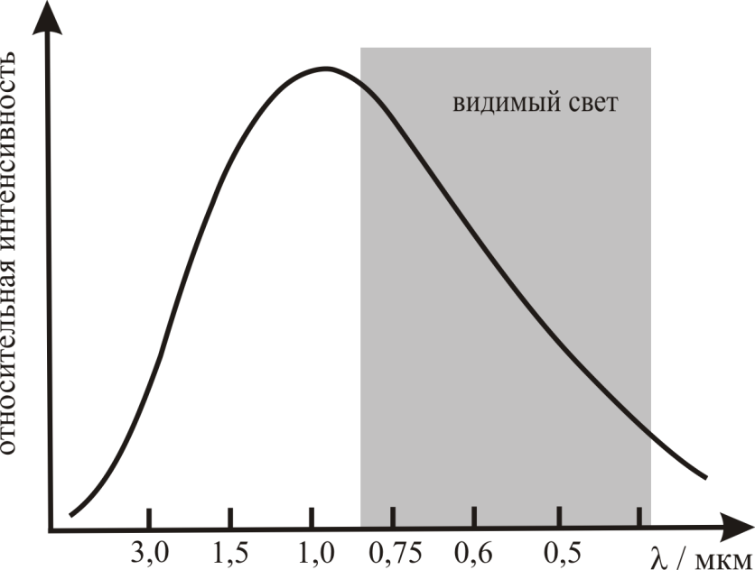 Рис. 1. Примерный вид спектра излучения абсолютно черного тела при температуре 3500К. Линейчатый спектр испускания излучения дают пары и разряженные газы при сильном нагревании. Каждый газ излучает свет определенной длины волны и дает линейчатый спектр характерный только для данного элемента (рис.2). Изменение состояния газа или условий его свечения отражаются в спектре.