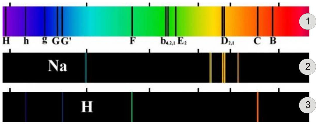 Рис.2. Спектры излучения водорода (3), паров натрия (2) и Солнца (1). Линейчатый спектр поглощения дают газы и пары, если за ними находится источник света, дающий непрерывный спектр. В этом случае на фоне непрерывного спектра наблюдаются темные полосы поглощения, расположенные в тех местах, где должны находиться линии излучения какого либо газа (рис.2). Например, в спектрах Солнца и звёзд на сплошной спектр излучения накладывается дискретный спектр поглощения. Возникают темные линии, которые называются Фраунгоферовыми линиями (они названы в честь немецкого физика Й.Фраунгофера, см. портрет), который впервые их обнаружил в 1814 г.). В видимой области спектра Солнца наиболее интенсивны линии ионизованного кальция и линии водорода.