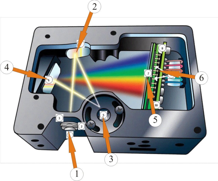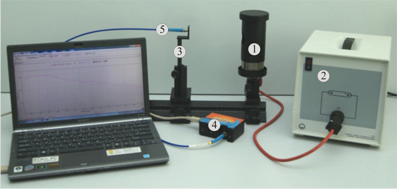 Рис.3 Внешний вид экспериментальной установки ü источник излучения, натриевая лампа 1, с блоком питания 2; ü держатель 3; ü спектрометр «Red Tide USB-650» (4); ü оптическое волокно 5, связывающее держатель со спектрометром; ü компьютер с установленной программой Spectra Suit. Принцип работы спектрометра Red Tide USB-650. Ниже схематично показан путь света через оптический модуль спектрометра. Свет через оптическое волокно поступает на входную щель 1 (рис.4). Она представляет собой узкую прорезь, сделанную в непрозрачной пластине, и имеет фиксированную ширину 25 мкм.