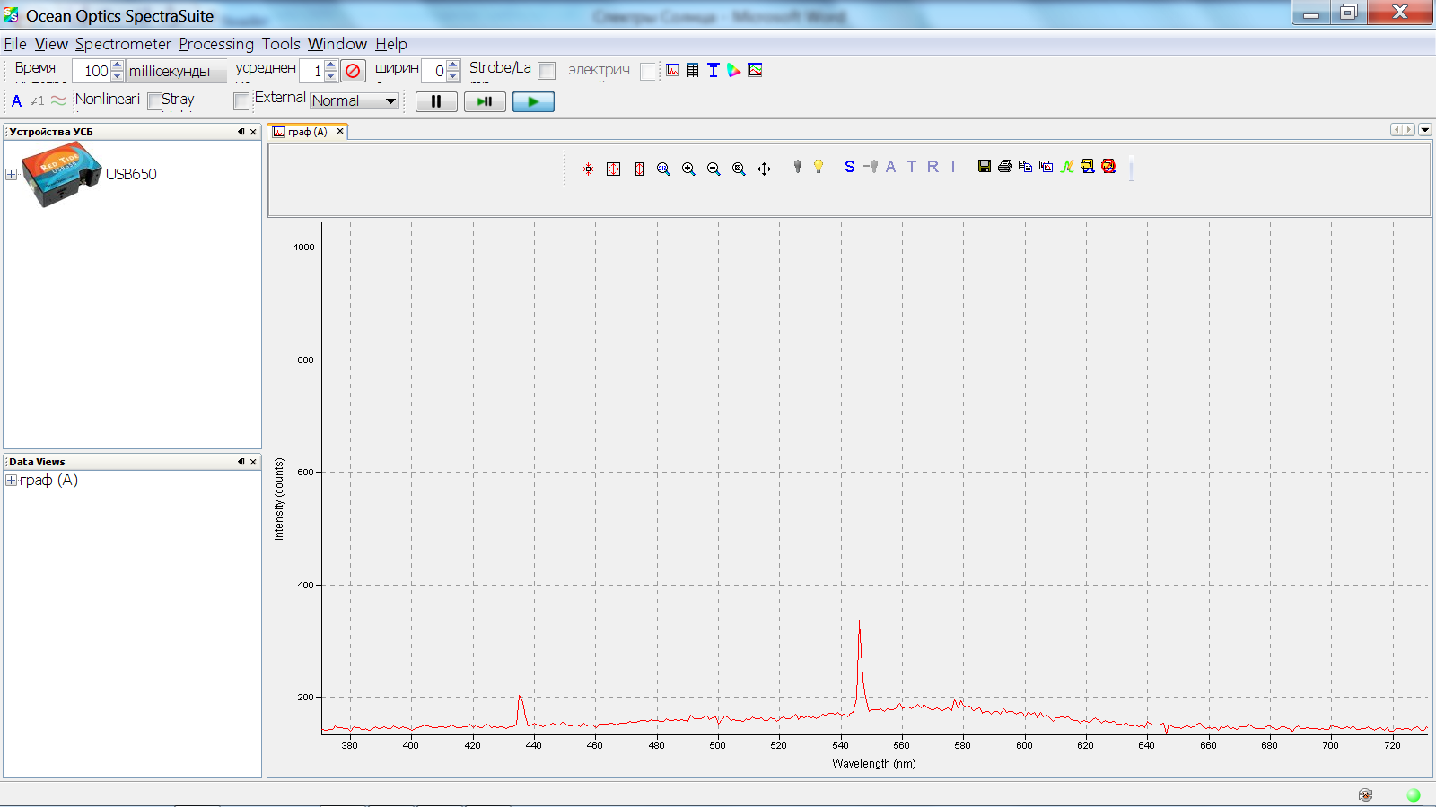 При регистрации спектра важно, чтобы регистрируемый сигнал не превышал 4000 отсчетов (один отсчет соответствует попаданию на светочувствительную матрицу 75 фотонов). Для этого необходимо правильно выбрать время накопления сигнала, которое задается с помощью кнопок «Время», расположенных в верхней левой части экрана (рис.7). Диапазон изменения этого параметра составляет от 3 мс до 65 с. Чем больше время накопления сигнала, тем больше сигнал. Рекомендуется подбирать этот параметр таким, чтобы сигнал не превышал 3500 отсчетов. С помощью кнопок «Усреднение» можно выводить на экран усредненный спектр. Число спектров, которые Вы хотите усреднить, задается в соответствующем окошке (рис.7).