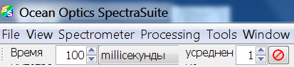 Рис.7. Строка выбора времени регистрации и числа усредняемых спектров. Порядок выполнения работы: Упражнение 1. Регистрация спектра излучения Солнца и отнесение фраунгоферовых линий к химическим элементам. 1. Направьте держатель со световодом на освещенное окно лаборатории. Вы должны быть уверены, что кроме дневного света в спектрометр не попадает свет от других источников (ламп накаливания, ламп дневного освещения и др.). 2. С помощью кнопки «Время» (рис.6) установите время регистрации такое, чтобы максимальное значение в спектре не превышало 3500 отсчетов. На экране появится спектр излучения Солнца, дошедшего до поверхности Земли. Поэтому кроме линий поглощения, возникающих в фотосфере Солнца, в наблюдаемом спектре появляются сильные линии поглощения воды и озона, находящихся в атмосфере Земли. Для уменьшения уровня шума с помощью кнопки «Усреднение» установите число усредняемых спектров (6 - 10 спектров). 3. Наведите курсор мыши на поле спектра и щелкните правой кнопкой мыши. В появившемся окне выберите опцию «Graph Layer Options», затем в верхней строке - «Visible Spectrum» и далее «Show visible spectrum layer» - «Clip visible spectrum to trendline». 4. Сохраните спектр в формате tab-delimited для того, чтобы в последствии иметь возможность его анализировать с помощью других программных оболочек, например, Excel. 5. Сохраните также спектр в качестве верхнего слоя, нажав кнопку 6. Дважды кликнете мышью на спектре. Появится линия-курсор. Ее положение по длинам волн (в нм) показывается внизу экрана. Линию-курсор можно перемещать по экрану двумя способами: (1) подвести курсор мыши в заданную точку спектра и щелкнуть мышью или (2), набрав интересующую длину волны, нажать «Enter». Шаг перемещения линии-курсора 1 нм. 7. Найдите в спектре: - линии натрия D1 и D2, - линии водорода F и C, - линии кальция К и Н. Упражнение 2. Сопоставление спектра Солнца со спектром излучения Na. 1. Установите на одном конце оптической скамьи натриевую лампу 1, а на другом держатель 3 со световодом 5 (рис.3). 2. Включите лампу и дайте ей разогреться 1 - 2 минуты. 3. С помощью кнопки «Время» (рис.6) установите время регистрации такое, чтобы максимальное значение в спектре не превышало 3500 отсчетов. На экране появится спектр излучения паров натрия. Для уменьшения уровня шума с помощью кнопки «Усреднение» установите число усредняемых спектров (6 - 10 спектров). На экране дисплея Вы должны наблюдать спектр натрия и спектр Солнца, который Вы сохранили в качестве верхнего слоя. 3. Сохраните спектр паров натрия в формате tab-delimited для того, чтобы в последствии иметь возможность анализировать его с помощью других программных оболочек, например, Excel. 4. Сохраните этот спектр в качестве верхнего слоя, нажав кнопку 5. Обратите внимание, что линия излучения натрия в области 589 нм совпадает с одной из линий поглощения в спектре Солнца.