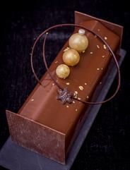 Рождественская ночь Шоколадный бисквит, карамелизованный фундук, кремю жиандуйя с сычуанским перцем, шоколадный баваруа с фундуком, фундучная глазурь
