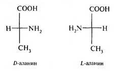 Молекула α-аланина содержит асимметричный атом углерода и существует в виде пары энантиомеров.