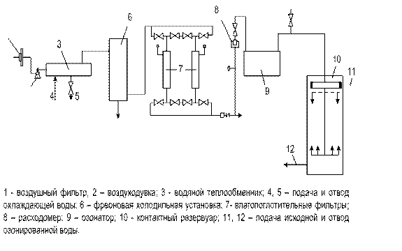 Для того чтобы снизить повышенное содержание патогенных бактерий и вирусов будет использоваться метод озонирования воды. Преимуществом этого метода, что одновременно с обеззараживанием происходит обесцвечивание воды, а так же ее дезодорация и улучшение вкусовых качеств. Озонаторный котел (рис1) представляет собой горизонтальный цилиндрический аппарат с монтированными в него из нержавеющей стали трубками по типу теплообменника. Внутри каждой трубки помещена стеклянная трубка с небольшой кольцевой воздушной прослойкой, являющейся разрядным пространством. внутренняя поверхность стеклянных трубок покрыта графитомедным покрытием. Стальные трубки являются одним из электродов, а покрытия на внутренних стенках стеклянных трубок – другим. К стальным трубам проводят электрический переменный ток напряжением 8…10кВ, а покрытие на стеклянных трубках заземляют. При прохождении электрического тока через разрядное пространство происходит разряд коронного типа, в результате которого образуется озон. Предварительно осушенный и очищенный воздух проходит через кольцевое пространство и таким образом озонируется, т.е. образуется озоновоздушная смесь. Стеклянные трубки являются диэлектрическим барьером, благодаря чему разряд получается «тихим», т.е. рассеянным без образования искр. При этом до 90% электроэнергии превращается в теплоту, которую отводит от озонатора циркулирующая в межтрубном пространстве аппарата охлаждающая вода. Доза озона принимаем равную 1мг/л. Продолжительность контакта воды с озоном 5минут.