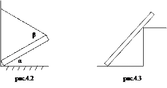 (2 R ctgα) 4.2. Колесо массой m и радиусом R стоит перед гладкой ступенькой высотой h < R (рис. 4.1). Какую минимальную горизонтальную силу F надо приложить к оси колеса, чтобы оно смогло подняться на ступеньку? (mg √ h (2 R ─ h) /(R ─ h)) 4.3. Балка массой 60 кг упирается одним концом в угол между стеной и полом (рис. 4.2). Угол наклона балки к горизонту α = 30о. К другому концу балки привязан канат, угол между балкой и канатом β = 60о. Найдите силу натяжения каната и силы давления балки на стену и пол. (300 Н, 260 Н, 450 Н) 4.4. Доска стоит на горизонтальной поверхности, опираясь на гладкий горизонтальный выступ и составляя с горизонтом угол 45° (рис. 4.3). За выступ выходит 1/4 часть доски. Найдите минимальное значение коэффициента трения между доской и горизонтальной поверхностью, при котором доска покоится. (0,5)