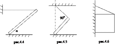 4.5. К гладкой вертикальной стене приставлена однородная лестница массы m, наклоненная под углом α к горизонту. Найдите силы, действующие на лестницу со стороны стены и пола. Под каким минимальным углом к полу может стоять лестница, если коэффициент трения между лестницей и полом равен μ? (mg ctgα/2, mg, ctgα =2μ) 4.6. Однородный стержень опирается о шероховатый пол и удерживается в равновесии горизонтальной нитью (рис. 4.4). Коэффициент трения между стержнем и полом равен μ. При каком минимальном значении угла α между стержнем и полом это возможно? (tgα = 1/2μ) 4.7. Каким должен быть коэффициент трения однородного стержня о пол, чтобы он мог стоять так, как показано на рис. 4.5. Длина нити равна длине стержня. (1/3)