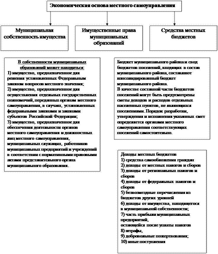 Экономические основы местного самоуправления – это совокупность правовых норм, закрепляющих и регулирующих общественные отношения, связанные с формированием и использованием муниципальной собственности, местных бюджетов и иных местных финансов в интересах населения муниципального образования