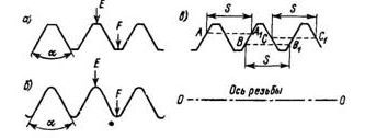 1. Профиль резьбы является основным признаком, характеризующим резьбу. Профилем резьбы называется сечение ее витка плоскостью, проходящей через ось цилиндра (т. е. диаметральной плоскостью), на котором образована резьба. Элементы профиля резьбы — это его боковые стороны, угол, вершина и впадина. Углом профиля называется угол между боковыми сторонами витка, измеренный в диаметральной плоскости. Вершиной профиля называется линия, соединяющая боковые стороны его по верху витка (Е) — рис.1, а, б.