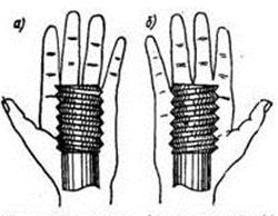 Рис.2. Правые и левые резьбы. Если подъем резьбы винта, положенного на ладонь правой руки, совпадает с направлением отогнутого большого пальца, эта резьба правая. Совпадение подъема резьбы с направлением отогнутого большого пальца левой руки указывает, что данная резьба левая. На винт с правой резьбой гайка навертывается при вращении вправо (по часовой стрелке), на винт с левой резьбой при вращении влево (против часовой стрелки). 6. Системы резьб. В машиностроении приняты следующие системы резьб, различающиеся прежде всего по профилю: треугольные (метрическая, дюймовая и трубная), трапецеидальные, прямоугольные, упорные и круглые. Наиболее распространенными являются метрические резьбы с крупным (крепежная) и мелким шагом. У всех метрических резьб угол профиля равен 60°. Шаг метрических резьб измеряется в миллиметрах. Между впадиной профиля резьбы болта и вершиной профиля резьбы гайки всегда имеется зазор. Имеется зазор и между вершиной профиля резьбы болта и впадиной профиля резьбы гайки. Метрической резьбой снабжаются детали (болты, гайки, винты, шпильки и т. д.), предназначенные для соединения частей машин. Этой резьбой пользуются также, как способом непосредственного соединения частей машин (посадка на резьбе различных рукояток, масленок и т. д.). Угол профиля дюймовой резьбы равен 55°. Шаг дюймовой резьбы выражается числом витков на один дюйм. Дюймовая резьба имеет зазоры по вершинам и впадинам. Дюймовую резьбу имеют детали некоторых импортных машин, станков и т. д., поэтому детали с такой резьбой изготовляются главным образом при ремонте. Трубная резьба имеет угол профиля 55°, причем вершина и впадина профиля закруглены. Трубная резьба не имеет зазоров по вершинам и впадинам и обеспечивает водонепроницаемость. Этой резьбой снабжаются главным образом водо- и газопроводные трубы и различные детали (муфты, угольники и т. д.), применяемые для соединения этих труб. Профиль трапецеидальной резьбы — это трапеция с углом, равным 30°. Профиль резьбы образован прямыми линиями, с небольшими закруглениями углов у впадин и вершин. Шаг трапецеидальных резьб измеряется в миллиметрах. Трапецеидальные резьбы имеют зазоры. Существуют крупная, нормальная и мелкая трапецеидальные резьбы. Трапецеидальную резьбу применяют на винтах, используемых для преобразования вращательного движения одной детали (например, ходового винта токарного станка) в поступательное движение другой (суппорта). Профиль прямоугольной резьбы — это в большинстве случаев квадрат со сторонами, равными половине шага; эта резьба не имеет зазоров. Прямоугольная резьба применяется так же, как трапецеидальная, на различных винтах, передающих движение. Она не стандартизована и встречается редко, так как почти полностью вытеснена трапецеидальной. В упорной резьбе соприкосновение винта и гайки в упорной резьбе происходит между сторонами, воспринимающими нагрузку, а также между вершинами витков винта и впадин гайки. По остальным участкам профиля имеется зазор. Упорная резьба делается на муфтах трубопроводов, соединяющих компрессоры с резервуарами со сжатым под сильным давлением воздухом, а также на винтах гидравлических прессов, домкратов и т. д.