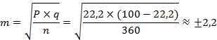 Врачи детской поликлиники совместно с медицинскими работниками школ города Н. провели выборочное обследование старшеклассников на предмет выявления миопии. Осмотрено 360 учащихся 9, 10 и 11-х классов, миопия обнаружена у 80. Задание: оцените частоту миопии у старшеклассников, с помощью соответствующего статистического метода сделайте прогноз о частоте нарушения зрения для генеральной совокупности учащихся 9, 10 и 11-х классов. 1. Вычислим ошибку репрезентативности относительного показателя: