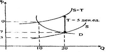 Задача 17. Если при выпуске 10 единиц продукции валовые издержки составили 1430 руб., а при выпуске 11 единиц -1470 руб., то предельные издержки равны... а) 40 руб.; б) 143 руб.; в) 133,6 руб.; г) 50 руб. Задача 18. Торговец грушами – наемный работник фирмы «Надежда» – получил для реализации 100 кг, закупленных оптом по 5. руб. / кг. Менеджер установил план: за день продать все по цене 7 руб. До 18.00 удалось продать 70 кг по этой цене. Оставшиеся груши начали портиться, поэтому после 18.00 торговец продал их по 4.руб. Определите размер полученной прибыли. Задача 19. Государство вводит налог (Т) на цену товара (Р). По данным графической модели определите величину государственных сборов по введенному налогу …