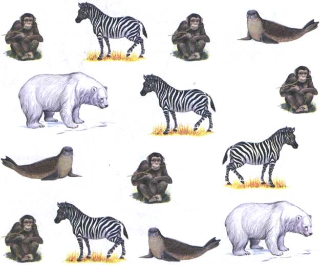 1. Рассмотреть вместе с ребенком картинки. Познакомить его с названиями животных. Рассказать, какие животные обитают в жарких странах и на севере. Закрепить в словаре обобщающие понятия «животные жарких стран», «животные севера».