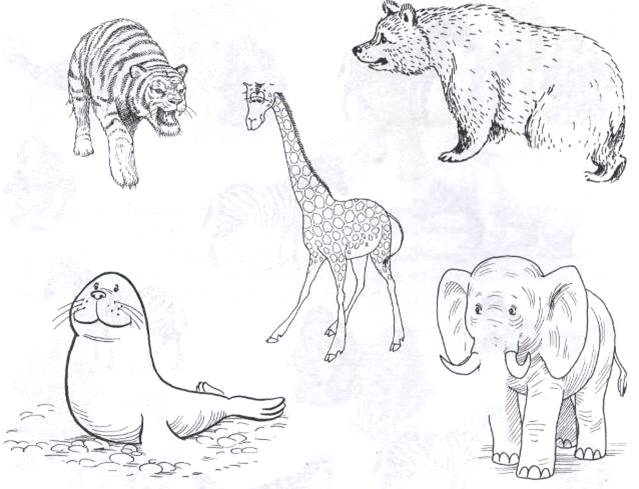 9. Упражнение «Скажи одним словом». У слона толстые ноги, поэтому его называют толстоногим. У жирафа короткая шерсть, поэтому его называют.... У обезьяны длинный хвост, поэтому ее называют.... У жирафа длинная шея, поэтому его называют.... У слона большие уши, поэтому его называют.... У моржа длинные усы, поэтому его называют.... 10. Упражнение «Что забыл нарисовать художник?». Кого нарисовал художник? Чего