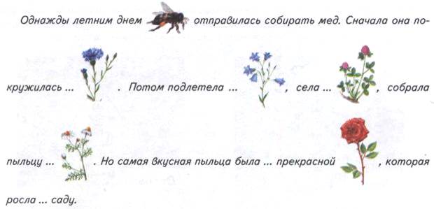 5. Рассказать ребенку, что не все цветы мож 6. Букет цветов — замечательный подарок к 7. Послушай рассказ. Вставь в предложения Принесли птицы на крыльях весну. От теплых солнечных лучей полянки оттаяли от снега, и на проталинках появились первые цветы — первоцветы:... В мае в лесу распустились..., а в парках и на клумбах расцвели весенние цветы:.... Скоро и лето подоспело. Рассыпало оно по лугам и по полям самые красивые цветы: И клумбы в парках уже украсили другие цветы — летние:.... Закончилось лето. Яркими красками раскрасила осень парки и сады. Распустились на клумбах.... Скоро придет зима. На улице станет морозно, снежным одеялом укроются леса, поля и сады. Но за зимой обязательно будет весна. И снова цветы начнут радовать нас своими яркими красками. 8. Упражнение «Путешествие пчелы». Рассмотри картинки. Дополни предложения предлогами (проследить за точностью употребления предлогов в речи).