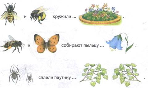 11. Упражнение «Нелепицы». Послушай предложения, расскажи, чего не бывает. А как должно быть на самом деле? Муравей живет в улье. Паук собирает нектар с цветов. Бабочка стрекочет. Муха плетет паутину. Комар ловит птиц. Шмели строят муравейник. 12. Упражнение «Составь предложения». Рассмотри картинки и составь предложения. Образец: Паутина висит между веток.