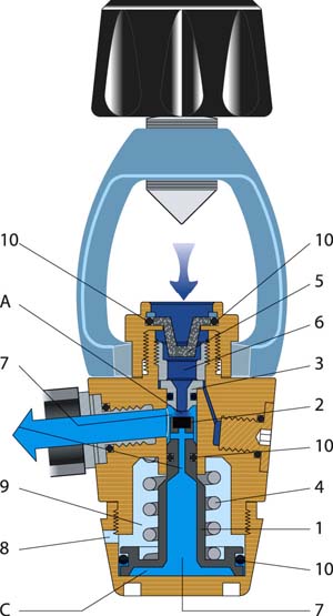 И так, поршневой несбалансированный регулятор 1-й ступени. В современной линейке регуляторов Aqua Lung это NEW CALYPSO. Рассмотрим устройство и работу регулятора NEW CALYPSO (рис.1). Рисунок 1. Схема поршневого несбалансированного регулятора NEW CALYPSO. 1 - поршень; 2 - подушка клапана; 3 - седло клапана; 4 - пружина; 5 - фильтр; 6 - камера высокого давления; 7 - камера редуктора; 8 - гидростатическое отверстие; 9 - гидростатическая камера; 10 - уплотнительные кольца (O-ring); А - полость камеры редуктора; В - сквозной канал поршня; С - полость камеры редуктора. Управляющим элементом поршневого несбалансированного регулятора является поршень (1), нижняя часть которого является клапаном. В торце поршня закреплена съемная подушка клапана (2). Седло клапана (3) жестко закреплено в корпусе. Если регулятор не нагружен, то клапан открыт, т.к. поршень отжат пружиной (4). При открытии вентиля баллона сжатый воздух устремляется через фильтр (5) в камеру высокого давления (6). Далее через открытый клапан в полость "А" камеры редуктора (7). Затем по сквозному каналу "В" в поршне (1) воздух проходит в полость "С" камеры редуктора среднего давления (7). На поверхности, при достижении в камере редуктора (7) давления 9.2 бар, усилие от давления воздуха на верхнюю часть поршня преодолевает усилие пружины (4) и давление на подушку клапана сжатого воздуха, выходящего из баллона, в результате чего клапан закрывается. В момент вдоха в полости "А" камеры редуктора создается разряжение воздуха, при этом давление в полости "С" соответственно понижается, и под действием пружины (4) поршень движется вверх - клапан открывается, пропуская воздух на вдох. При прекращении вдоха камера редуктора (7) наполняется воздухом до установочного давления и клапан закрывается. При таком устройстве регулятора давление сжатого воздуха баллона напрямую оказывает воздействие на клапан. Сжатый воздух, поступающий из баллона, как бы помогает пружине (4) открыть клапан. Поэтому если в баллоне давление сжатого воздуха низкое, клапан открывается медленнее, что приводит к медленному наполнению редуктора. В этом проявляется несбалансированность простого поршневого регулятора. Но, как известно, в каждом недостатке есть часть достоинств. Во-первых, согласно требованиям систем обучения подводному плаванию, Вы должны начать подъем на поверхность до того, как у Вас в баллоне останется меньше 50 бар. А при таком количестве воздуха в баллоне дыхание еще вполне легкое. Во-вторых, если Вы забыли проконтролировать давление воздуха в баллоне при помощи манометра, то уменьшение запаса воздуха приведет к увеличению сопротивления на вдохе. Это будет сигналом к началу всплытия, а оставшегося воздуха Вам хватит "за глаза".