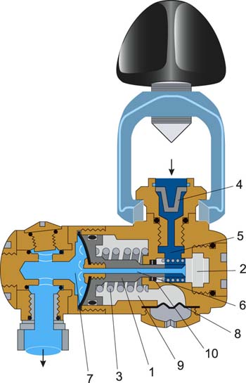 В современной линейке регуляторов Aqua Lung нет поршневого сбалансированного регулятора. Они были сняты с производства в середине 90-х годов прошлого столетия. Компания Aqua Lung решила больше не производить регуляторы этого типа. Дело в том, что их конструкция гораздо сложнее простых поршневых, и, следовательно, они значительно дороже в производстве. Более того, поскольку компания Aqua Lung уделяет огромное внимание устойчивости регуляторов к обмерзанию, то себестоимость производства поршневых сбалансированных холодноводных регуляторов возрастает еще больше. Фактически они становятся дороже мембранных регуляторов. И это было бы оправдано, если бы они обладали лучшими характеристиками по сравнению с мембранными регуляторами, но дело обстоит совсем наоборот. В рекламных проспектах редко приводятся технические характеристики, требующие специального объяснения, поэтому мало кто знает, что одним из основных показателей работы регулятора первой ступени является величина падения давления в камере редуктора при вдохе. Эта величина показывает, на сколько должно уменьшиться давление в камере редуктора, чтобы открылся клапан, и началась подача воздуха во вторую ступень. Чем меньше величина падения давления, тем быстрее регулятор реагирует на потребность в подаче воздуха в начальной фазе вдоха. Проконтролировать это можно, вкрутив в порт редуктора 3/8" проверочный манометр низкого давления. Так вот, конструктивные особенности поршневых регуляторов принципиально не позволяют сделать эту величину менее 1 бар. В то время как самый обычный мембранный регулятор имеет величину падения давления в камере редуктора 0.5 бар, т.е. мембранные регуляторы как минимум в 2 раза чувствительнее поршневых. Поэтому компания Aqua Lung решила, что если уж и производить поршневые регуляторы, то только - простые (несбалансированные). Их конструкция проста и надежна, они стоят почти в два раза дешевле мембранных регуляторов. Именно их невысокая цена является хорошим оправданием некоторых компромиссов в качестве дыхания. Последний поршневой сбалансированный регулятор, выпускавшийся компанией Aqua Lung и до сих пор эксплуатирующийся многими дайверами, это PIONEER. Рассмотрим его устройство и работу (рис 2). Рисунок 2. Схема поршневого сбалансированного регулятора Pioneer. 1 - поршень, 2 - подушка клапана; 3 - пружина; 4 - фильтр; 5 - камера высокого давления; 6 - сквозной канал поршня; 7 - камера редуктора; 8 - мембрана; 9 - гидростатическая камера; 10 - уплотнительное кольцо поршня (O-ring). Управляющим элементом поршневого сбалансированного регулятора является поршень (1). Подушка (2) клапана жестко закреплена в корпусе регулятора. Торец поршня является седлом клапана. Если регулятор не нагружен, то клапан открыт, т.к. поршень отжат пружиной (3). При открытии вентиля баллона сжатый воздух устремляется через фильтр (4) в камеру высокого давления (5). Затем через открытый клапан и сквозной канал в поршне (6) воздух попадает в камеру редуктора (7). На поверхности при достижении в камере редуктора (7) давления 9.2 бар, усилие от давления воздуха на верхнюю часть поршня преодолевает усилие пружины (3), и поршень закрывает клапан. В момент вдоха в камере редуктора (7) создается разряжение воздуха, давление понижается, и под действием усилия пружины (3) поршень открывает клапан и пропускает воздух на вдох. При пре