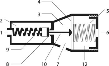Мембранные несбалансированные регуляторы также довольно бессмысленны с экономической точки зрения. Их себестоимость сравнима со сбалансированными мембранными регуляторами, но их рабочие характеристики заведомо ниже, так как их работа зависит от давления сжатого воздуха в баллоне. В настоящее время регуляторы этого типа практически не производятся никакими компаниями. Здесь мы приведем лишь принципиальную схему устройства мембранного несбалансированного редуктора (рис.3). Рисунок 3. Принципиальная схема мембранного сбалансированного регулятора. 1 - сжатый воздух; 2 - камера высокого давления; 3 - камера редуктора; 4 - мембрана; 5 - пружина; 6 - давление воды; 7 - выход на 2-ю ступень; 8 - клапан; 9 - пружина; 10 - толкатель; 11 - регулировочная гайка; 12 - гидростатическая камера. Регулятор имеет камеру высокого давления (2), камеру редуктора (3) и гидростатическую камеру (12). Камера редуктора отделена от гидростатической камеры мембраной (4) - управляющим элементом мембранного регулятора. Регулировочная пружина мембраны (5) расположена в гидростатической камере и крепится гайкой (11), которая регулирует степень сжатия пружины (5) и, следовательно, давление пружины (5) на мембрану (4). Прогибаясь внутрь камеры редуктора (3), мембрана изменяет давление в этой камере. Так происходит регулировка установочного давления. В камере высокого давления (2) расположен клапан (8), который подпирается пружиной (9). Посредством толкателя (12) мембрана связана с клапаном (8). При нагруженном регуляторе, когда делается вдох, воздух в камере редуктора (3) разряжается, вследствие этого мембрана (4) прогибается внутрь камеры редуктора и через толкатель (10) открывает клапан. В результате воздух устремляется на выход на вторую ступень через порт среднего давления (7). При прекращении вдоха камера редуктора заполняется сжатым воздухом до установочного давления, мембрана (4) выпрямляется в исходное положение, и клапан закрывается. В такой конструкции положение клапана зависит от положения мембраны, на которую давит пружина (5) с одной стороны и от степени сжатия пружины (9) и давления сжатого воздуха, поступающего из баллона, с другой стороны. Причем, чем больше давление воздуха в баллоне, тем большее усилие необходимо сделать, чтобы открыть клапан. Чтобы уменьшить влияние давления сжатого воздуха на работу клапана, его отверстие делалось как можно меньше. Однако, это сказывалось на производительности редуктора.