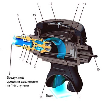 По своему принципу работы все дыхательные автоматы очень похожи. Рассмотрим устройство и работу дыхательных автоматов на примере регулятора Aqua Lung CALYPSO (Рис.1). Это простейший несбалансированный дыхательный автомат в линейке регуляторов Aqua Lung – базовая конструкция, рассмотрев которую, можно будет легче понять преимущества более продвинутых моделей. Управляющим элементом всех известных дыхательных автоматов является мембрана (1). Она разделяет корпус дыхательного автомата на две камеры – воздушную (11) и водную (13). В воздушной камере всегда поддерживается давление, равное давлению окружающей среды, т.е. давлению в водной камере. Именно при таком давлении мы можем сделать вдох. Вдох мы делаем из воздушной камеры (11). В нее же мы и выдыхаем. Поэтому при выдохе получается автоматическое выравнивание давления по обе стороны мембраны – воздушная камера наполняется выдыхаемым воздухом до давления "за бортом", а излишки воздуха стравливаются через односторонний лепестковый клапан выдоха. Если мы представим себе гипотетическую ситуацию, когда мы задерживаем дыхание на поверхности и при этом погружаемся, то с глубиной под давлением воды мембрана прогибается вниз – в воздушную камеру, надавливая на рычаг (2). Рычаг открывает клапан, и воздух из первой ступени под давлением поступает в воздушную камеру дыхательного автомата. Поступление воздуха продолжается до тех пор, пока давление в воздушной камере (11) не увеличится и не станет равным давлению воды, тогда мембрана (1) вернется в исходное положение, и клапан закроется. Таким образом, в воздушной камере дыхательного автомата все равно будет поддерживаться давление, равное давлению окружающей среды, и регулятор будет наготове, чтобы мы смогли сделать вдох.