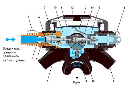 Отдельного рассмотрения требует эффект инжекции потока (эффект Вентури). Эффект Вентури является следствием закона Бернулли, согласно которому давление газа или жидкости обратно пропорционально скорости их движения. На уроках физики многим из нас демонстрировали действие этого закона. Возьмите лист бумаги формата А4, согните и разорвите его вдоль пополам. Затем, удерживая параллельно две образовавшиеся полоски бумаги на расстоянии 5-10 см друг от друга, подуйте сквозь образовавшийся канал. Вместо ожидаемого расхождения, полоски сомкнутся. Происходит это из-за того, что давление воздуха, движущегося между полосками, понижается по сравнению с давлением воздуха с внешней стороны полосок. Точно также ведет себя мембрана дыхательного автомата в фазе вдоха, т.е. когда клапан второй ступени уже открыт. Поток воздуха, движущийся в воздушной камере дыхательного автомата, имеет меньшее давление по сравнению с давлением с внешней стороны мембраны, в результате чего мембрана еще больше прогибается внутрь воздушной камеры – происходит самопроизвольная инжекция воздуха. Это продолжается до тех пор, пока поток воздуха не прекращается, и мы начинаем совершать выдох. Т.е. по сути, этот эффект помогает нам на фазе вдоха. Все дыхательные автоматы Aqua Lung оснащены системой регулировки инжекции (Вентури). Эта система представляет собой заслонку (9 на рис.1 и рис.3), которая перенаправляет поток воздуха внутри воздушной камеры дыхательного автомата. Иногда переключатель Вентури называют Dive/Pre-Dive Switch, т.е. переключатель режимов "до погружения"/"погружение". В положении "максимум" (рис.3) канал полностью открыт для потока воздуха, т.е. инжекция задействована по максимуму. Если, например, при открытом вентиле баллона нажать на кнопку принудительной подачи воздуха, то дыхательный автомат весьма шумно встанет на постоянную подачу, даже если Вы перестанете нажимать на кнопку. Остановить свободную подачу Вы сможете, либо прикрыв ладонью загубник, либо переведя переключатель Вентури в положение "минимум" (рис.3а). Поэтому, чтобы избежать возможной свободной подачи воздуха регулятором при прыгании в воду, когда существует вероятность случайного нажатия кнопки принудительной подачи в результате удара о воду, переключатель Вентури перед началом погружения переводят в положение "минимум" ("Pre-Dive"). Оказавшись под водой, переключатель можно перевести в положение "максимум" ("Dive"), чтобы дышалось легче. Как известно, согласно закону Гей-Люссака, в точке адиабатического расширения газа (расширение газа в результате перепада с большего давления на меньшее) происходит резкое падение температуры газа. Кстати, Вы можете наблюдать это явление, открыв вентиль баллона без присоединенного к нему регулятора – очень быстро верхняя часть баллона покроется инеем. Верно и обратное – при адиабатическом сжатии газа, происходит повышение его температуры. Поэтому при забивании баллона воздухом из компрессора баллон нагревается. В дыхательном автомате в точке выхода воздуха из клапана (назовем ее "точкой холода") температура воздуха понижается примерно до -30°С. Т.к. мы выдыхаем влажный воздух, то в точке крепления рычага к штоку клапана, где температура низкая, конденсируется влага, которая может превратиться в лед и вызвать заклинивание рычага, что, в свою очередь, может наруш