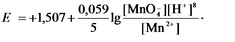 где «х» и «y» коэффициенты перед окисленной и восстановленной формой потенциалопределяющих частиц в ОВ-полуреакции. Например, для полуреакции окисления ионов Mn2+ Mn2++4H2O - 5 в которой слева – восстановленная форма потенциалопределяющих частиц, а справа – окисленная форма, уравнение Нернста для стандартной температуры будет иметь следующий вид: