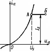 де g коефіцієнт, який залежить від геометричних розмірів і форми електродів. Анодний струм пропорційний анодній напрузі в степені трьох других (3/2), а не в першому степені, як у законі Ома. Якщо збільшити, наприклад, анодну напругу вдвічі, то анодний струм зросте в 2,8 рази (тому що 23/2≈2,8), тобто стане на 40% більшим, чим повинний бути за законом Ома. Графічно цей закон описується напівкубічною параболою (рис.9.4). Закон ступеня трьох других не застосуємо для режиму насичення, коли Іa = Is = const. Криву ОАБ деколи називають теоретичною характеристикою діода. Для діода з плоскими електродами