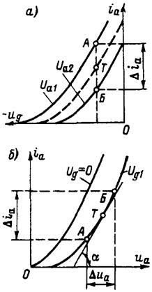 Значення μ (чи D) з характеристик знаходять по методу двох точок (рис. 12.7). Маючи анодно-сіткові характеристики для напруг Ua1 i Ua2 (рис.12.7, а), беруть точки А и Б для того самого анодного струму. Відрізок АБ виражає значення Δ Ug, а відповідне зміна анодної напруги Δ Ua = Ua1 - Ua2. Розділивши Δ Ua на Δ Ug отримують μ. Знайдене значення μ приблизно відповідає середній точці Т.