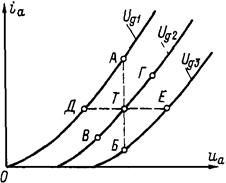 Рис.12.7. Визначення коефіцієнта підсилення тріода з характеристик На різних ділянках характеристик μ змінюється мало, тому що відстань між характеристиками по горизонталі (відрізок АБ) майже постійна. Таким чином, коефіцієнт підсилення (чи проникність) є найбільш постійним параметром. Для надходження μ з анодних характеристик точки А і Б беруться при тому самому струмі на двох характеристиках - для Ugl і Ug2 (рис.12.7,б). Відрізок АБ відображає зміну анодної напруги Δ Ua. Розділивши Δ Ua на Δ Ug = Ug1 – Ug2, одержують значення μ, що близько до значення μ для середньої точки Т. Усе сказане про визначення μ з характеристик відноситься і до визначення проникності D.