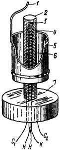 Рис.14.2. Конструкція тетрода: 1 - вивід анода; 2 - екран; 3 - катод; 4 - керуюча сітка; 5 - анод; 6 - екрануюча сітка; 7 – екран