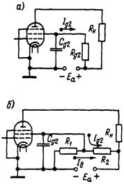 Рис.14.4. Схеми живлення екрануючої сітки через понижуючий резистор (а) і з допомогою подільника напруги (б)