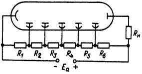З останнього, n -го, динода Найпростіший однокаскадний ФЕП має фотокатод, динод і анод. У багатокаскадних може бути коефіцієнт підсилення струму до декількох мільйонів, а інтегральна чутливість сягає десятків ампер на люмен. Як правило, ФЕП працюють при малих анодних струмах і малих світлових потоках. Струм анода зазвичай буває не більше десятків міліампер, а світлові потоки на вході можуть бути Оскільки на кожному наступному диноді напруга вища, ніж на попередньому, то анодна напруга повинна бути високою (1-2 кВ), що є недоліком ФЕП. Звичайне живлення ФЕП здійснюється через розподільник, на який подається повна анодна напруга (рис.16.7). В коло анода включається резистор навантаження Для ФЕП, як і для звичайних фотоелементів, характерний темновий струм, зумовлений термоелектронною емісією фотокатода і динодів. Він становить десяті частини мікроампера. Цей струм може бути зменшений за рахунок охолодження приладу. Значенням темнового струму обмежується мінімальний світловий потік, що можна реєструвати за допомогою ФЕП. А мінімальні зміни світлового потоку обмежуються флуктуаціями емісії фотокатода і темнового струму. Варто відмітити, що ці флуктуації невеликі, тобто ФЕП є приладами з низьким рівнем власних шумів.