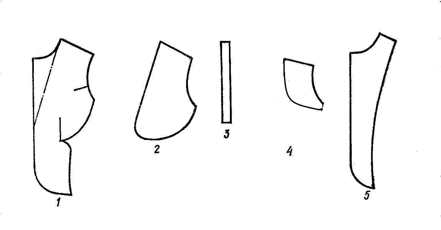 Рисунок 4 – Деталі бортової прокладки: 1 – основна бортова прокладка; 2 – нагрудна прокладка; 3 – звідка; 4 – плечова накладка; 5 – підпетельник.