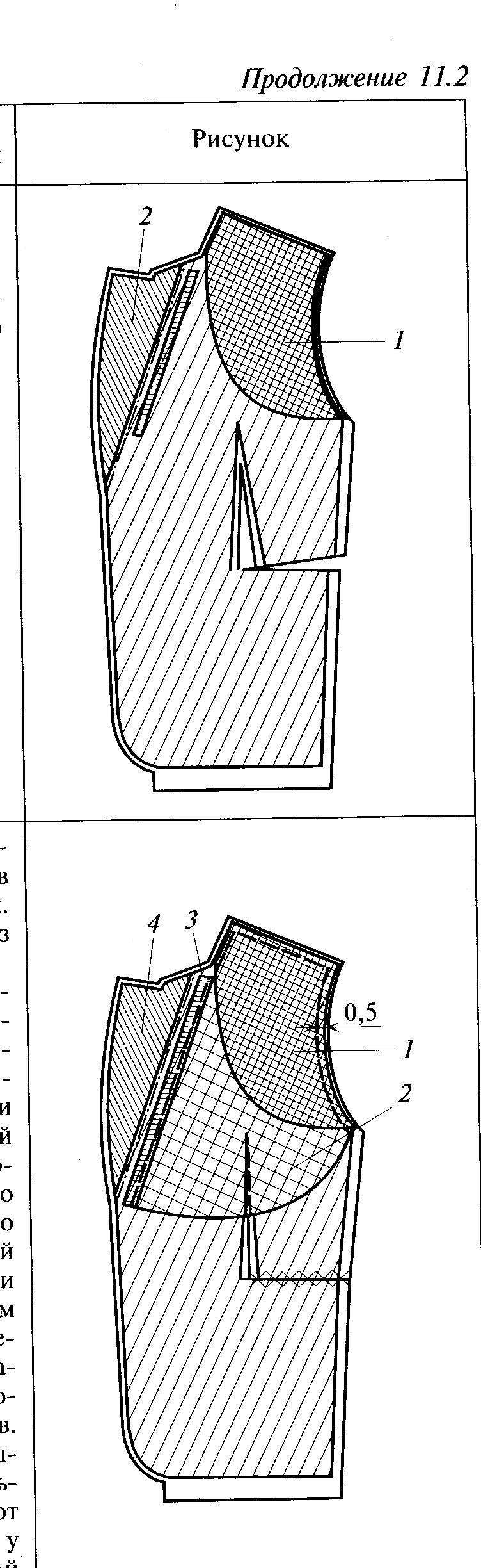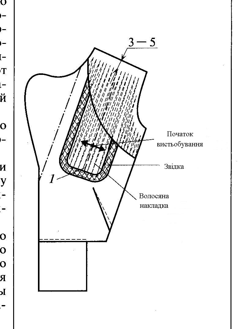 Напівжорстка форма має ще додаткову накладку на ділянці плеча, яку з’єднують з основною бортовою прокладкою після зшивання виточок і пришивання дошивок. З’єднують плечову накладку з основною бортовою прокладкою прямими строчками, які прокладають під кутом до плечового зрізу або до зрізу пройми. При обробці бортової прокладки для жіночих виробів припуск глибини виточки не вирізають, використовують як складову4 частину плечової накладки. Основну частину прокладки розрізають по наміченій лінії нагрудної виточки і зшивають, розташовуючи припуск у бік горловини (рис. 6). На основну частину бортової прокладки накладають плечову накладку, суміщаючи плечовий зріз і зріз пройми і вистьобують на зшивній машині або спеціальній машині зигзагоподібної строчки, з направленням від плечового зрізу до пройми по діагоналі. В виробах з обметаними петлями для скріплення ниток бортову прокладку на ділянках розташування петель покривають спеціальною клейовою емульсією. При відсутності емульсії на цих ділянках настрочують прокладку з нетканого або бавовняного прокладкового матеріалу. В бортових прокладках для виробів з тонких тканин на ділянці лацканів настрочують аналогічні прокладки для маскування стібків вистьобування лацканів. Прокладку під петлі настрочують по внутрішньому краю на відстані 2 мм від нього з боку сторони, що торкається пілочки, прокладку в лацкани – з протилежної сторони.
