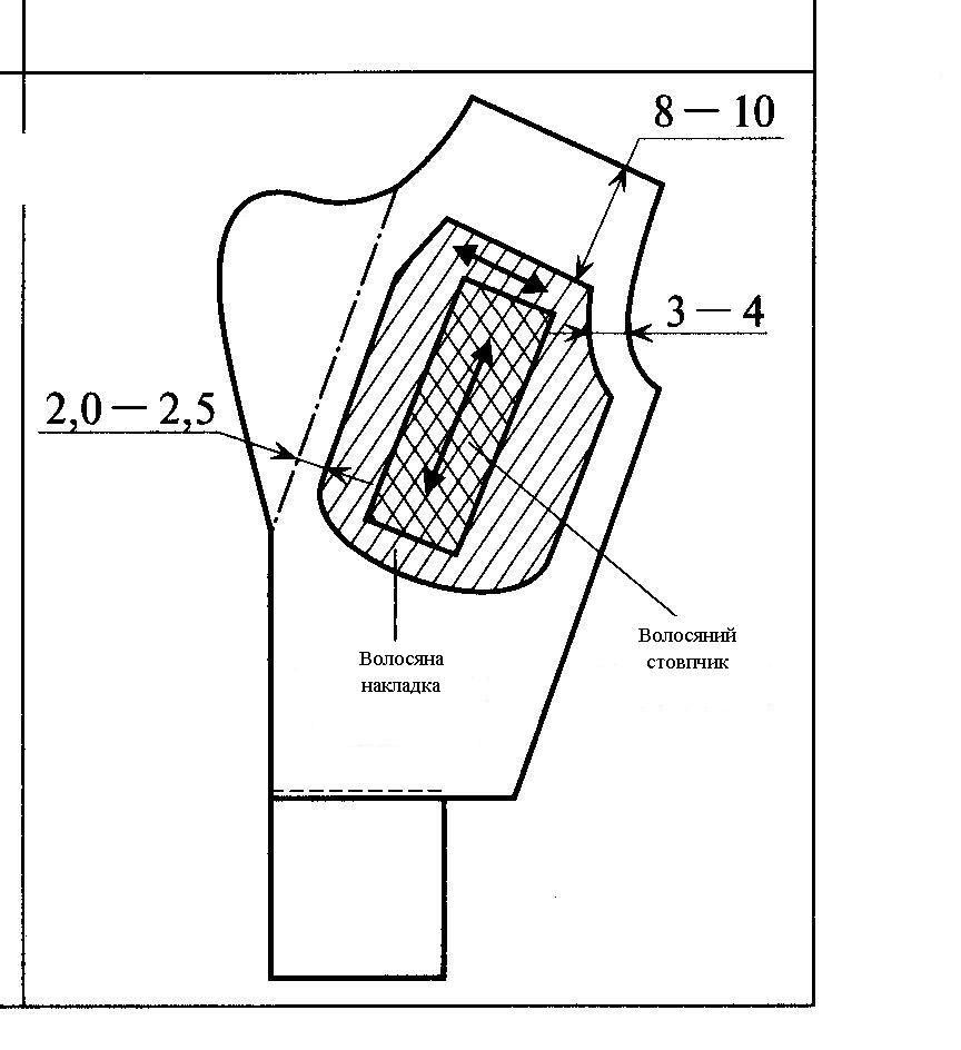 Обробка бортової прокладки з додатковими накладками. Після зшивання виточок і пришивання дошивок на центр випуклості грудей бортової прокладки накладають смужку з волосяної тканини (стовпчик) і волосяну накладку, розташовуючи її на відстані 20-25 мм від лінії перегину лацкану, 800-100 мм від плечового зрізу, 30-40 мм від пройми, і закріплюють їх по середині до бортової прокладки машинною строчкою, яку прокладають посередині стовпчика (рис. 7). На бортову прокладку накладають плечову накладку, суміщаючи плечові зрізи та зрізи пройми, закриваючи верхню частину волосяної накладки. Вистьобування виконують на зшивній машині або на машині зигзагоподібної строчки. Строчки прокладають вздовж деталі паралельно першій строчці. Спочатку від центру до лацкану, а потів від центру до зрізу пройми. При вистьобуванні деталі згинають у середину (для надання бортової прокладки випуклої форми на ділянці грудей). При вистьобуванні основна бортова прокладка посаджується. Відстань між строчками 1-2 мм. Щоб зберегти форму випуклості грудей і запобігти висипання волосу з волосяної прокладки, на неї настрочують звідку. Її укладають так, щоб зріз волосяної накладки співпав з серединою смужки. Строчки прокладають на відстані 2 мм від краю смужки. При настрочуванні звідки бортову прокладку посаджують. Для запобігання верху прокладку в плечовій частині надсікають (на відстані 40-50 мм від вищої точки горловини).